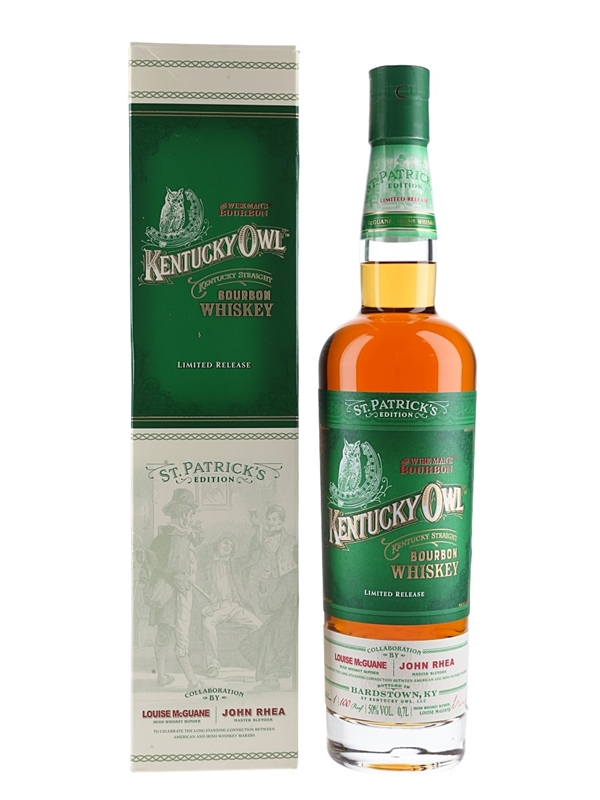 A limited release bottle of Kentucky Owl St Patrick's Edition Kentucky Straight Bourbon Whiskey, a collaboration between Louise McGuane, Irish Whiskey Bonder, and John Rhea, Master Blender, to celebrate the long standing connection between American and Irish Whiskey Makers.