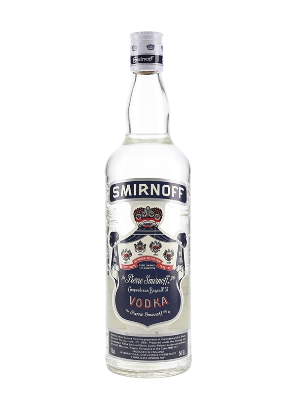 A bottle of Smirnoff Blue Label Vodka, produced in England by International Distillers & Vintners Ltd. for Duty Free stores. This was bottled for Duty Free stores, we estimate in the 1980s.