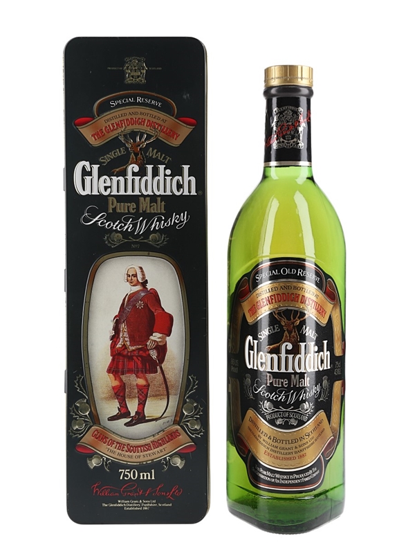 A bottle of Glenfiddich Special Old Reserve Single Pure Malt Scotch Whisky in a Clans of the Highlands of Scotland presentation tin. We estimate this was bottled in the early 1990s.