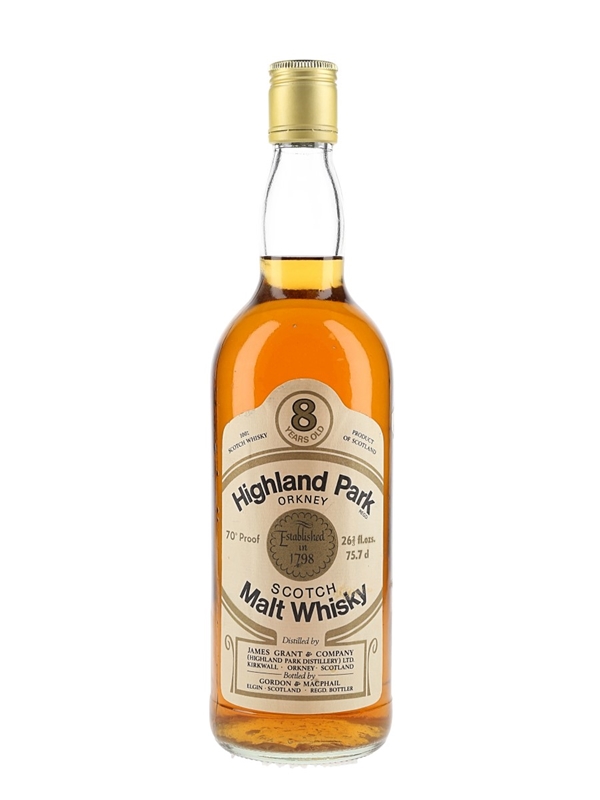 A bottle of Highland Park eight Year Old Orkney Scotch Malt Whisky, distilled by James Grant & Company and bottled by Gordon & MacPhail. We estimate this was bottled in the 1970s.