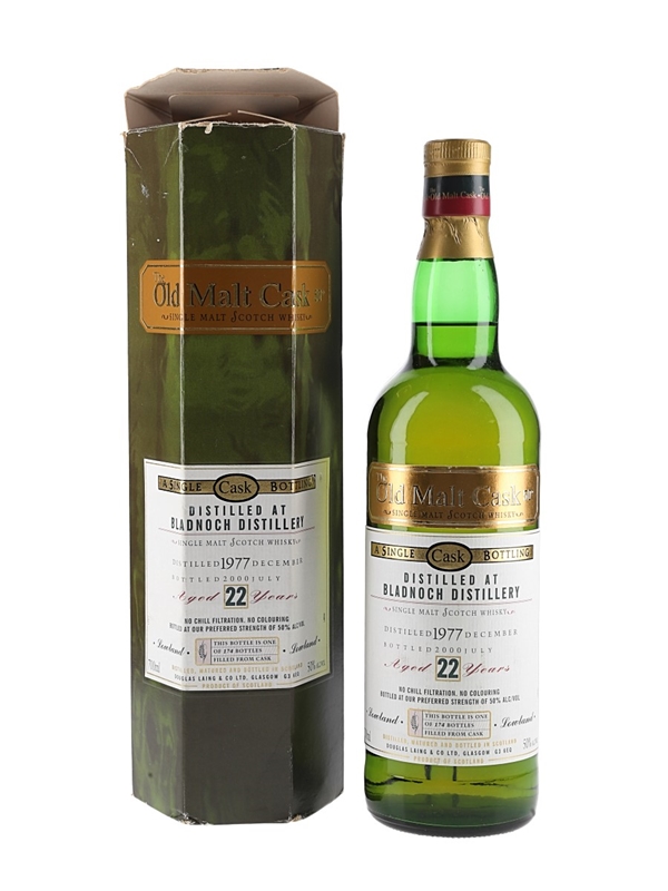 A bottle of Bladnoch 22 Year Old Single Malt Scotch Whisky. This was distilled in December 1977, matured in a single cask, and bottled in July 2000 for Douglas Laing's Old Malt Cask range.