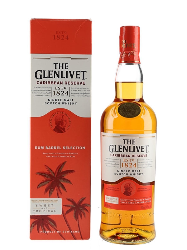 A bottle of The Glenlivet Caribbean Reserve Single Malt Scotch Whisky which spent its final maturation period in Caribebean Rum Barrels. The bottling code indicates this was bottled on 07 June 2022. This was distributed in the UK by Pernod Ricard.