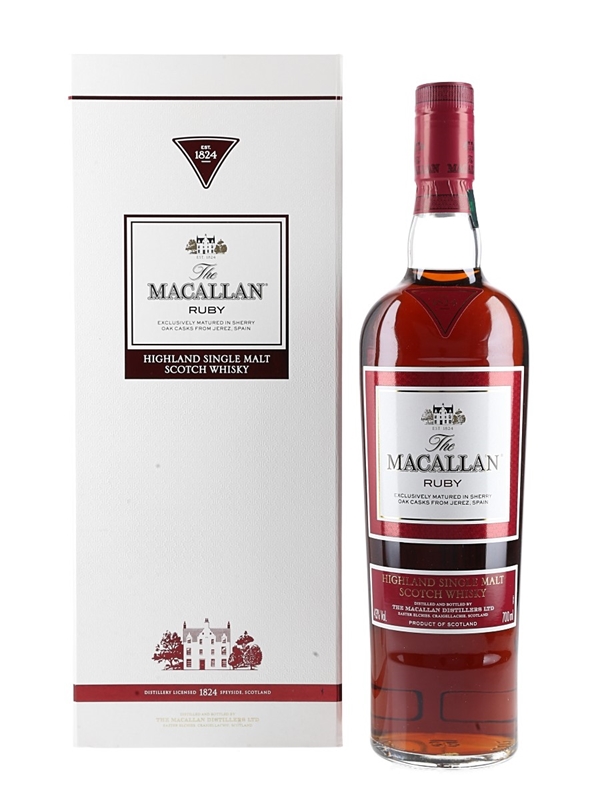 A bottle of The Macallan Ruby Highland Single Malt Scotch Whisky, released as part of The 1824 Series. This whisky was exclusively matured in sherry casks from Jerez, Spain, which imparted a deep ruby red colour to the whisky.