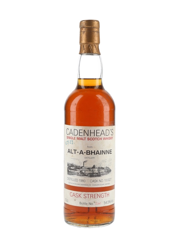 A bottle of Allt-A-Bhainne Cask Strength Single Malt Scotch Whisky. This was distilled in 1980, matured in a single cask and bottled at cask strength by Cadenhead's for their 'Distillery Label' range. This is bottle number 240; it was bottled from cask number 100027.