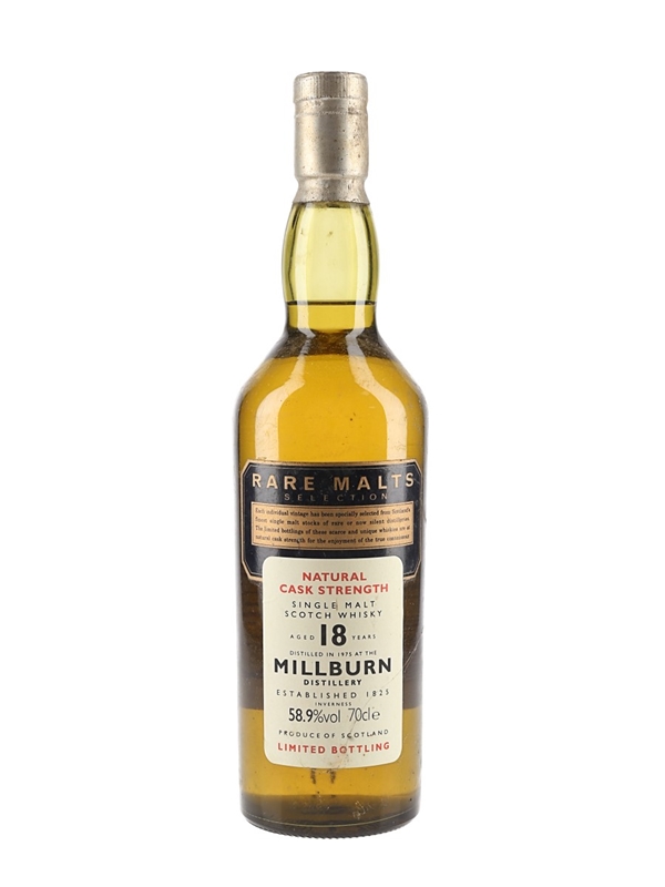 A limited bottling of Millburn 18 Year Old Natural Cask Strength Single Malt Scotch Whisky. This was distilled in 1975 and bottled at a cask strength of 58.9% ABV for Diageo's discontinued Rare Malts Selection.