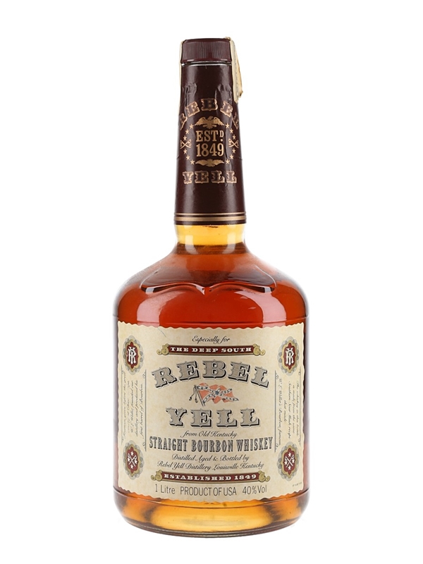 A litre bottle of Rebel Yell Kentucky Straight Bourbon Whiskey. We estimate this was bottled in the 1990s.