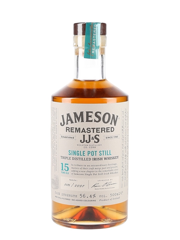 A bottle of Jameson 15 Year Old Remastered Single Pot Still matured in a combination of American bourbon barrels and oloroso sherry butts and bottled at cask strength of 56.4%.