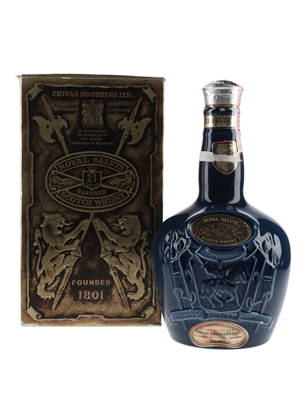 A bottle of Royal Salute 21 Year Old Blended Scotch Whisky produced by Chivas Brothers Ltd and presented in a blue ceramic decanter with the original velvet bag. We estimate this was bottled in the 1970s.