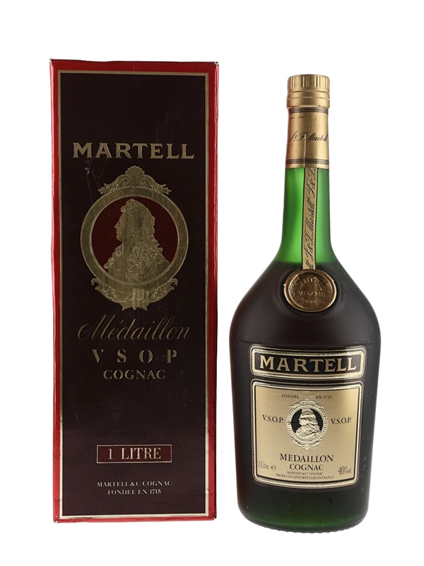 A litre bottle of Martell Medaillon VSOP Cognac, we estimate in the 1980s.