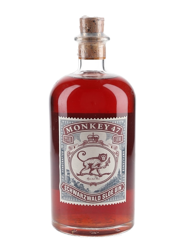 A 50cl bottle of Monkey 47 Schwarzwald Sloe Gin. This is distilled from 47 regional botanicals, and macerated with wild sloe berries from Germany's Black Forest. This was bottled from batch no. L15/2021. This one was produced in 2022.