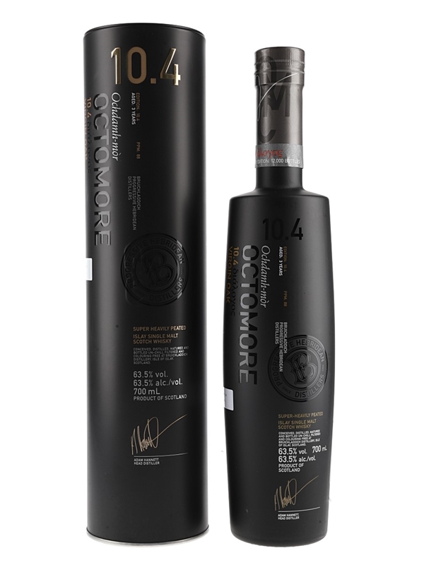A bottle of Octomore 3 Year Old Virgin Oak Edition 10.4, a super heavily peated single malt Scotch whisky from Islay's Bruichladdich distillery.