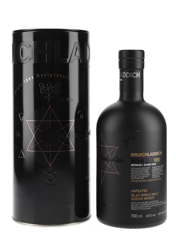 A bottle of Bruichladdich 26 Year Old Islay Single Malt Scotch Whisky, the sixth edition in the Black Art series. This was distilled in 1990 and bottled at 46.9% ABV.