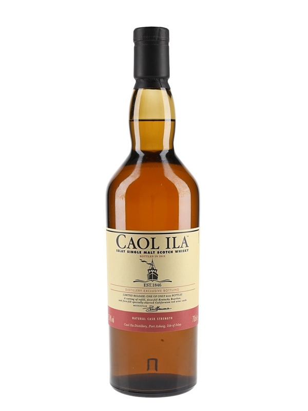 A bottle of Caol Ila Cask Strength Islay Single Malt Scotch Whisky. This distillery exclusive bottling is a vatting of Kentucky Bourbon and first-fill, specially-charred Californian red wine casks. It is a release of 6000 bottles and was bottled in 2018.