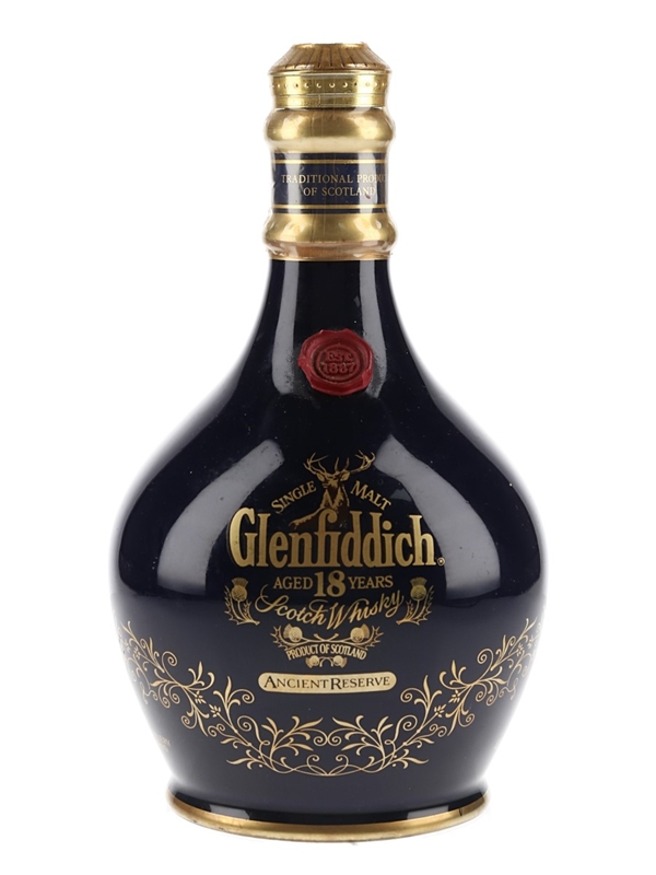 A bottle of Glenfiddich 18 Year Old Ancient Reserve, presented in a blue ceramic decanter. We estimate this was bottled in the 1990s.