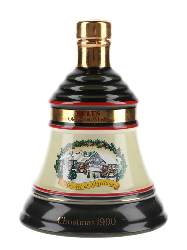 A bottle of Bell's Old Scotch Whisky presented in a ceramic decanter and released for Christmas 1990. The label depicts 'The Art of Distilling' with Blair Athol distillery blanketed in snow.