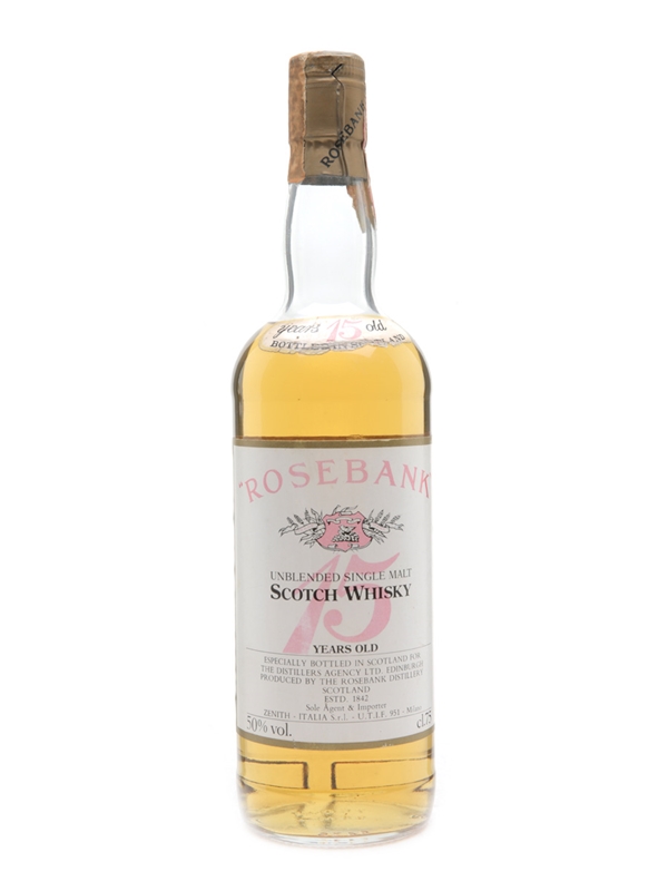 A bottle of Rosebank 15 Year Old, bottled at 50% ABV by the distillery before it closed in 1993. This was bottled for the Italian market and imported by Zenith, we estimate in the 1980s.