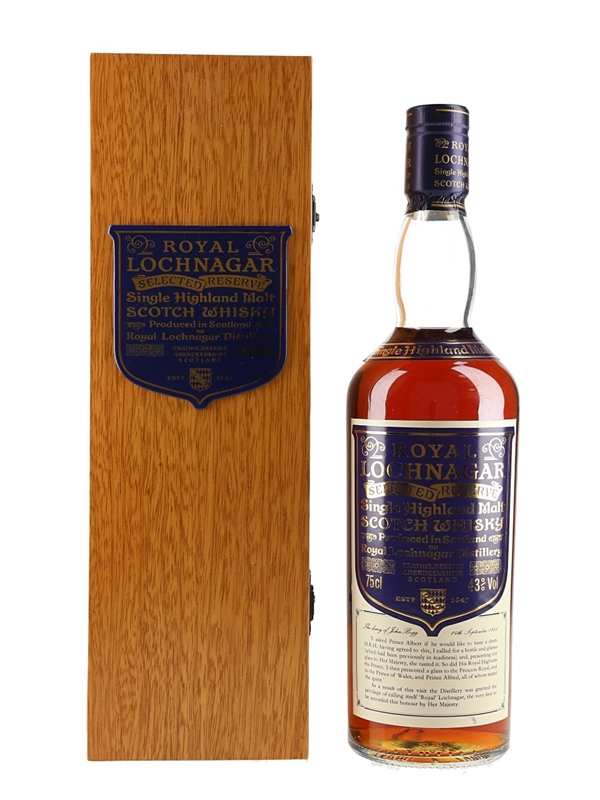 A bottle of Royal Lochnagar Selected Reserve Single Highland Malt Scotch Whisky, presented in a wooden box. We estimate this was bottled in the 1980s.