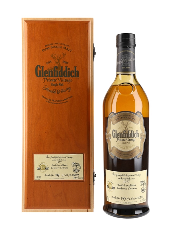 A limited edition bottle of Glenfiddich 1977 Private Vintage Single Malt Scotch Whisky. This was distilled in 1977 and bottled to celebrate the centenary of Turnberry golf course.