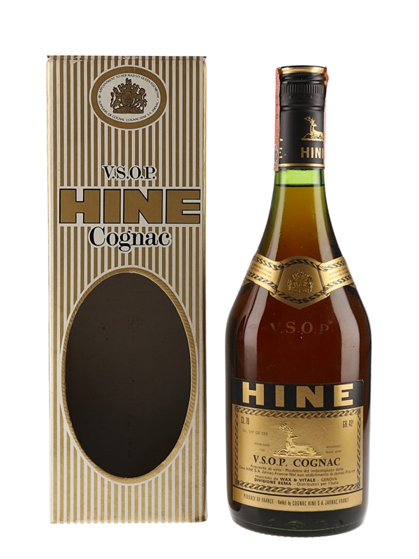 A bottle of Hine VSOP Vieux Cognac. This was bottled for Italian market and imported by Wax & Vitale, we estimate in the 1970s.