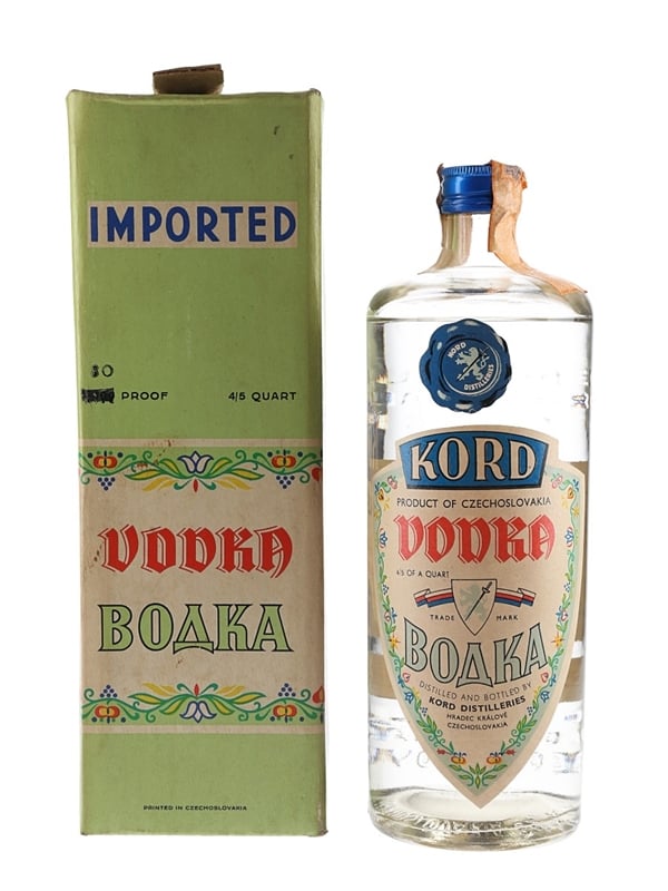 A bottle of Kord Czechoslovakian vodka. This was imported to Italian market, we estimate in the 1970s.