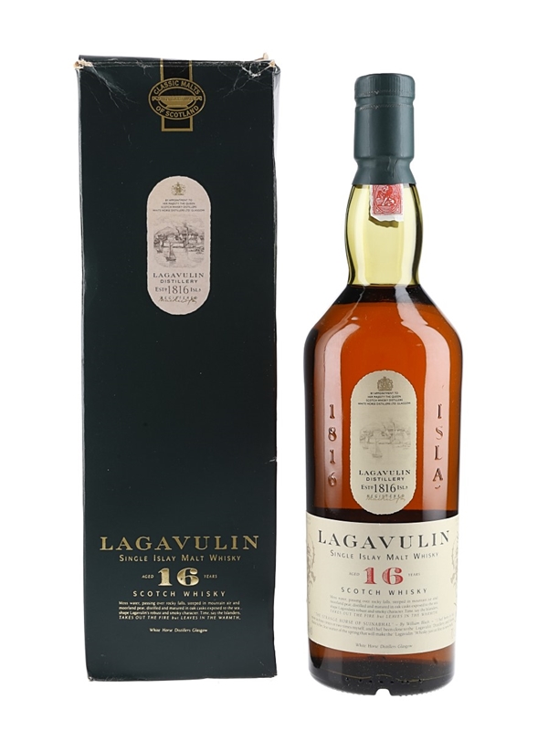 A bottle of Lagavulin 16 Year Old Single Islay Malt Scotch Whisky, part of Diageo's Classic Malts of Scotland range. We estimate this was bottled in the 1990s, when the distillery was still owned by White Horse Distillers.