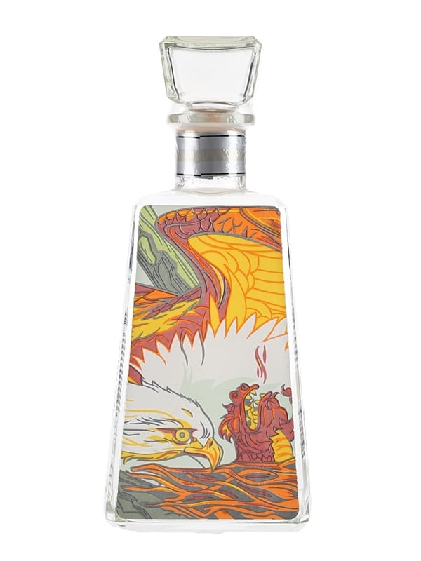 A limited edition bottle of 1800 Essential Silver Tequila, made from 100% agave. The label features a work designed by Josh Ellingson, Oakland artist. This was imported to the US market.