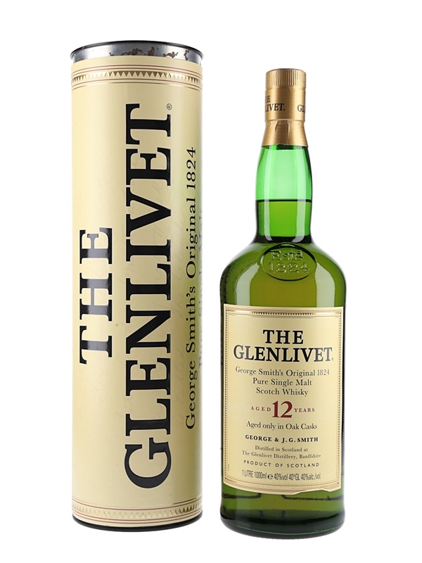 An old presentation litre bottle of The Glenlivet 12 Year Old Pure Single Malt Scotch Whisky.
