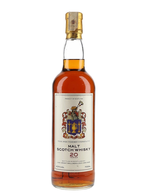 A bottle of The Founder's Company Malt Scotch Whisky 20 Year Old, bottled by J & G Grant, Ballindalloch, Speyside. We estimate this was bottled in the 1990s.