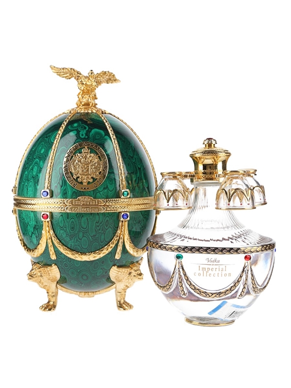 The presentation box contains a Emerald Fabergé style egg, decorated with crystal and gold detail and topped with a gold eagle. Inside the egg is a decanter containing super premium vodka, distilled from wheat and rye with water from Lake Ladoga, and four small glasses with gold and enamel decoration.