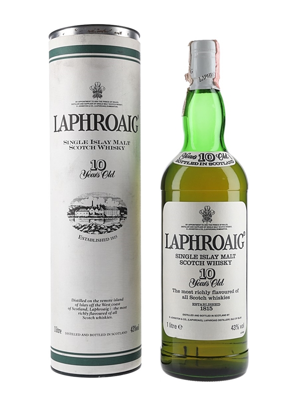 A litre bottle of Laphroaig 10 Year Old Unblended Islay Malt Scotch Whisky distilled and bottled by D.Johnston & Co. We estimate this was bottled in the 1990s.