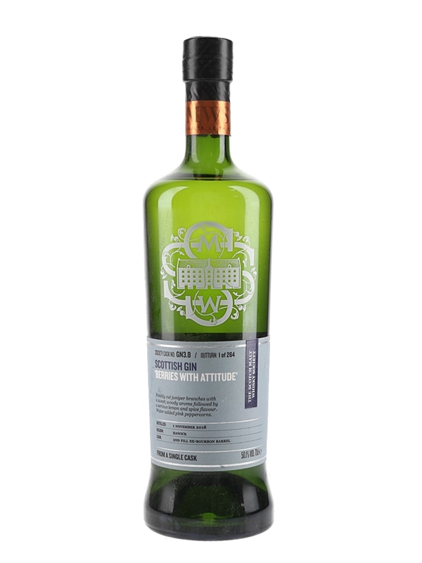 A bottle of Borders Distillery Scottish Gin from the Scotch Malt Whisky Society. This was distilled on 1 November 2018, matured in a second fill ex bourbon barrel before being bottled at 50.1% ABV. This is one of 264 bottles.
