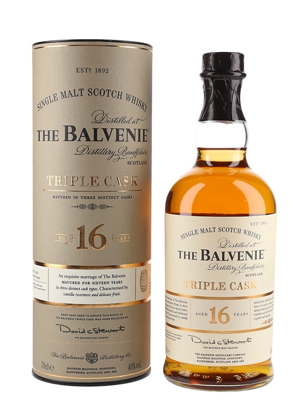 A bottle of The Balvenie 16 Year Old Triple Cask Single malt Scotch Whisky. This whisky was matured in three distinct casks, each one selected by The Balvenie Malt Master David Stewart: Oloroso sherry butts, followed by first-fill bourbon barrels and finally traditional whisky casks.
