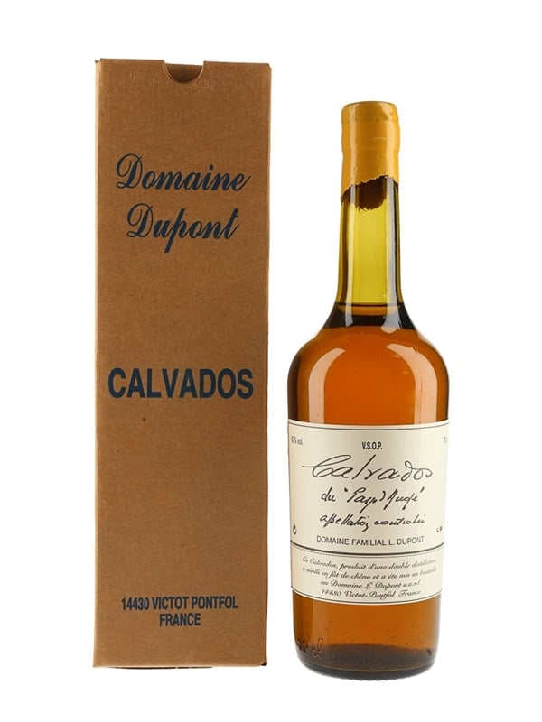 A bottle of Domaine Dupont VSOP Calvados bottled at 42% ABV in Domaine Familial L. Dupont, France.