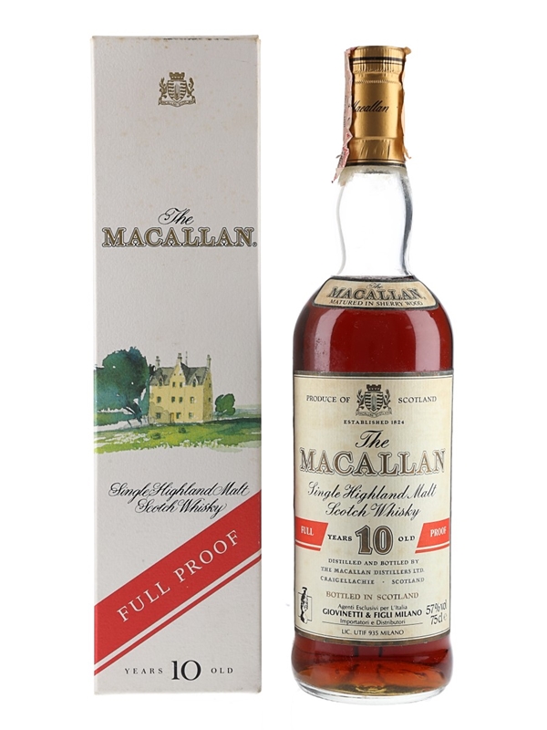 A bottle of The Macallan 10 Year Old 100° Proof Single Highland Malt Scotch Whisky, matured in sherry casks and bottled at 57% ABV. This was imported to Italy by Giovinetti, we estimate in the 1980s.