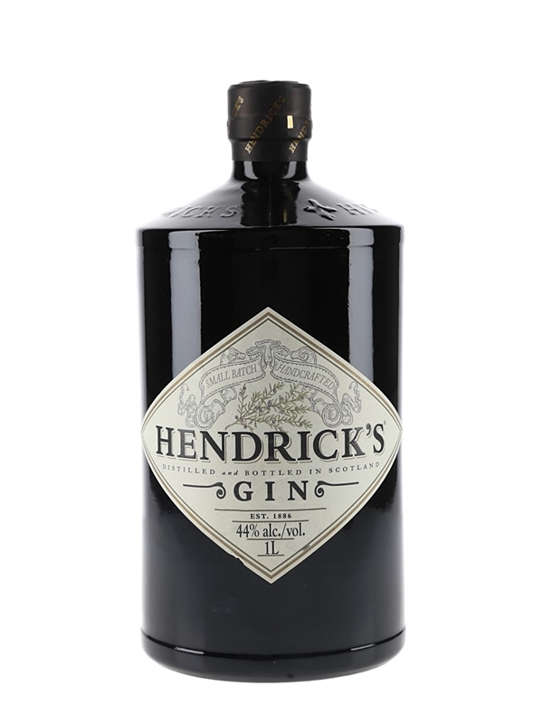 A litre bottle of Hendrick's Gin, produced in Scotland in small batches to a recipe which includes juniper, coriander, and citrus peel, as well as cucumber and rose petals.