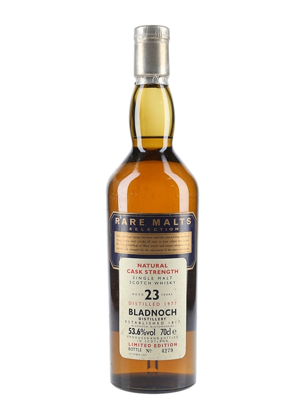 A bottle of Bladnoch 23 Year Old. This was distilled in 1977 and bottled in October 2001 as part of Diageo's now-discontinued Rare Malts Selection.