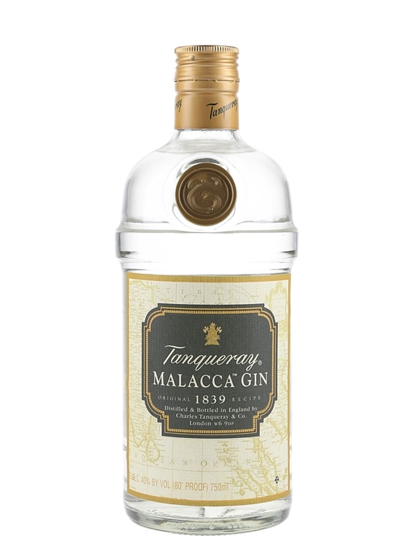 A bottle of Tanqueray Malacca gin, a sweeter gin with less juniper emphasis and more citrus than the classic style. This was originally introduced in the late 1990s, but discontinued after a short lifespan. Favoured by many bartenders as a good substitute for the original Old Tom styles of gin. This was imported to the USA by Schieffelin & Somerset Co., New York, we estimate in the 1990s.