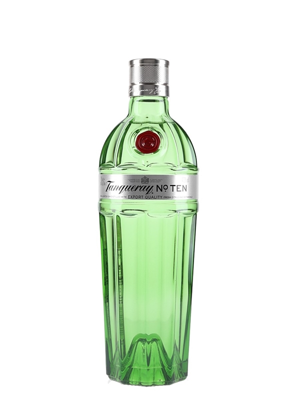 A bottle of Tanqueray No.Ten small batch gin distilled with Export Quality. This was named after the No. 10 still in which it was made. This was produced in Britain for Charles Tanqueray & Co. Lakeside Drive, Park Royal, London.