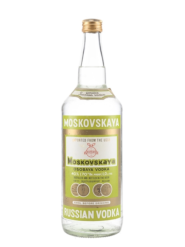 A litre bottle of Moskovskaya genuine Russian vodka. This was imported from Russia, we estimate in the 1970s.