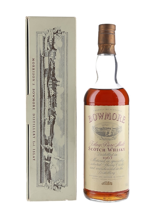 A bottle of Bowmore 1965 Full Strength Islay Pure Malt Scotch Whisky. This was distilled in 1965, matured in sherry casks and bottled at 50% ABV. We estimate this was bottled in the 1980s.
