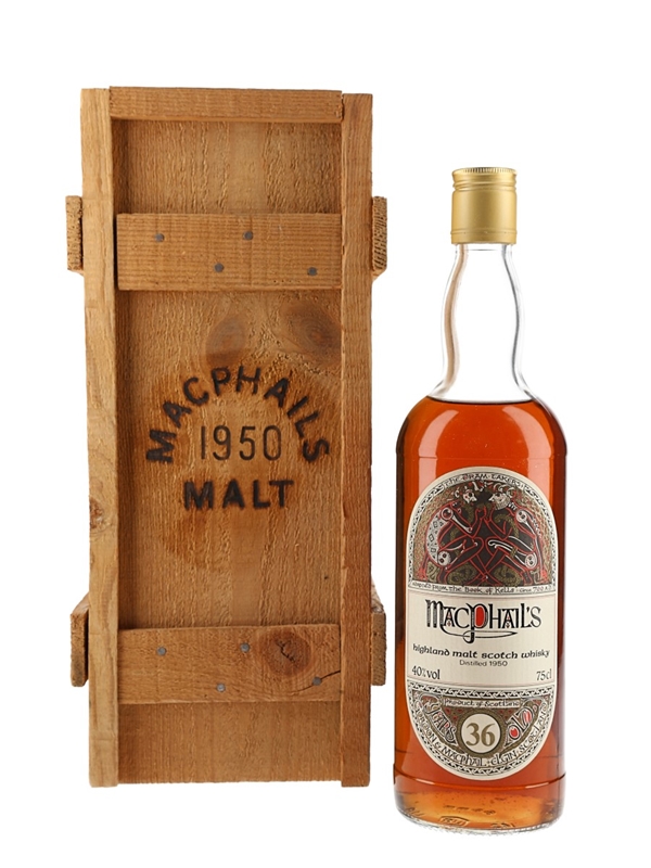 A bottle of MacPhail's 36 Year Old Highland Single Malt Scotch Whisky from an undisclosed distillery. This was distilled in 1950 and bottled by Gordon & MacPhail, we estimate in the 1980s.