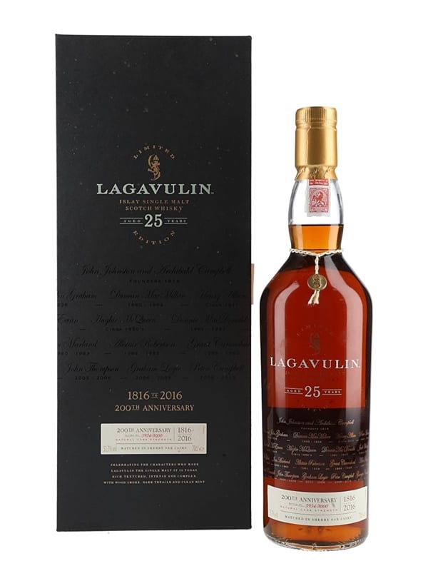 A bottle of Lagavulin 25 Year Old Single Malt Scotch Whisky matured in sherry cask, released to celebrate the distillery's 200th anniversary in 2016. The bottle carries the names of all the previous distillery managers.