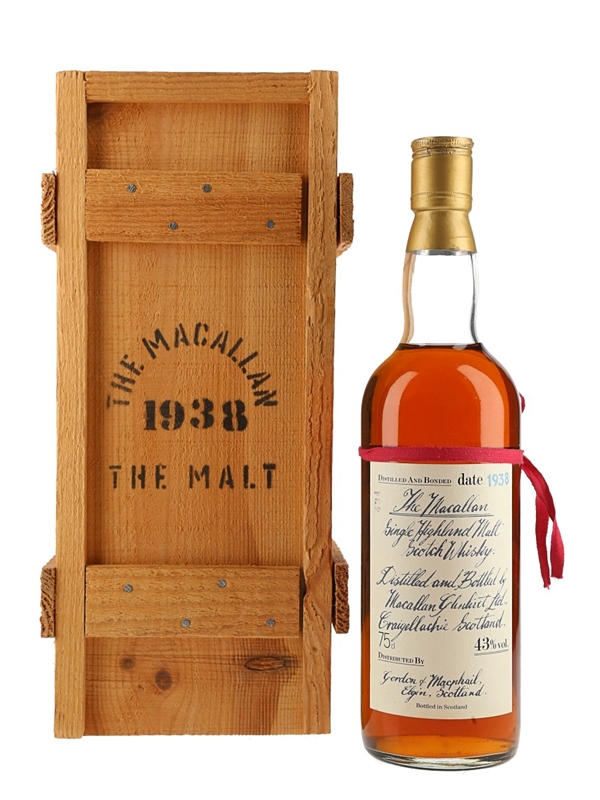A bottle of The Macallan 1938 Single Highland Malt Scotch Whisky, bottled in the 1980s by Gordon & MacPhail. This bottling has a handwritten label and is presented in a wooden box.