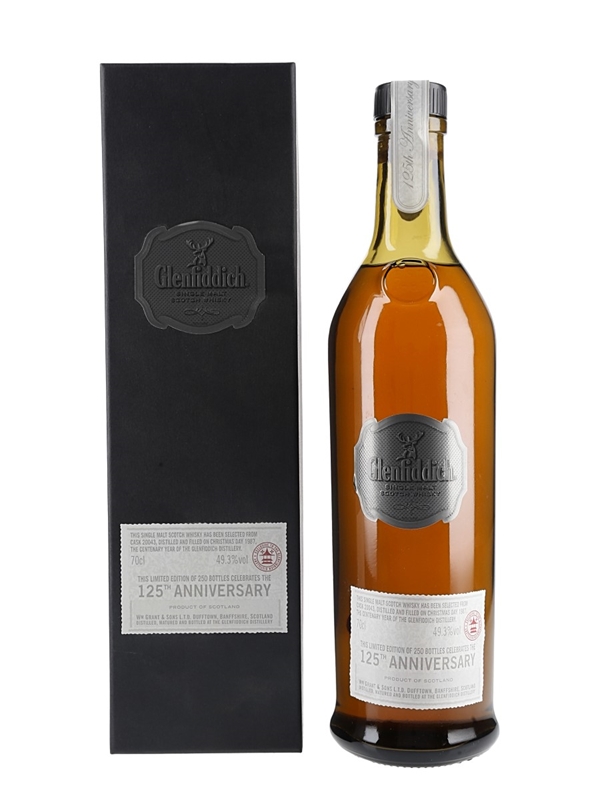 A bottle of Glenfiddich Single Malt Scotch Whisky distilled on Christmas Day 1987, the centenary year of the Glenfiddich, matured in a single cask and bottled to celebrate 125 years of the distillery.