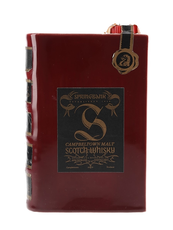 A bottle of Springbank 15 Year Old Volume IV Campbeltown Malt Scotch Whisky presented in a ceramic book-shaped decanter. This was imported to Italy by Consorzio Vinicolo, we estimate in the 1980s.