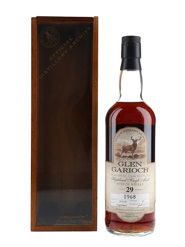 A bottle of Glen Garioch 29 Year Old Highland Single Malt Scotch Whisky. This was distilled on 18 May 1968 and bottled at cask strength in 1997 from a single hogshead held in the distillery archive.