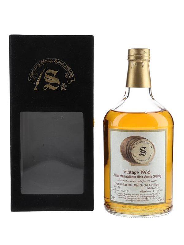 A bottle of Glen Scotia 27 Year Old Single Campbeltown Malt Scotch Whisky. This was distilled in April 1966, matured in oak casks, and bottled in January 1994 by Signatory Vintage.