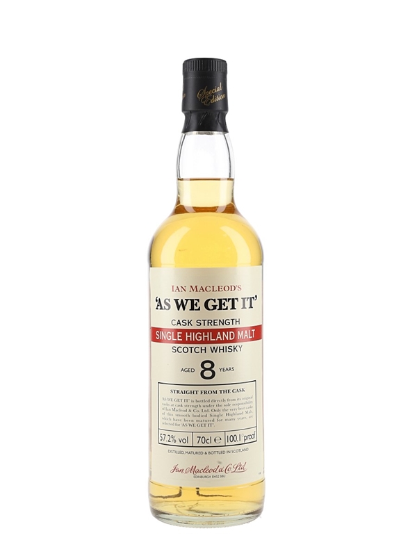 A bottle of Ian Macleod's Highland Single Malt 8 Year Old Scotch Whisky, distilled at an undisclosed Highland distillery and bottled straight from the cask at 57.2% ABV for the As We Get It series.
