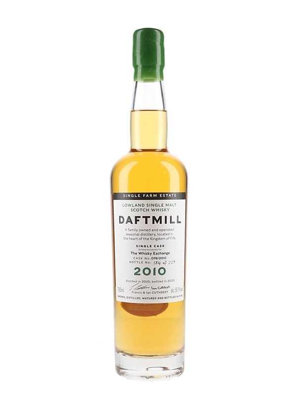 A bottle of Daftmill Lowland Single Malt Scotch Whisky. This was distilled in 2010, matured in single ex-bourbon barrel and bottled exclusively for The Whisky Exchange at 59.1% ABV in 2023.