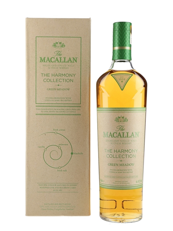 A bottle of The Macallan Green Meadow Highland Single Malt Scotch Whisky from The Harmony Collection. This was matured in a combination of sherry seasoned oak and bourbon casks before being bottled at 40.2% ABV.